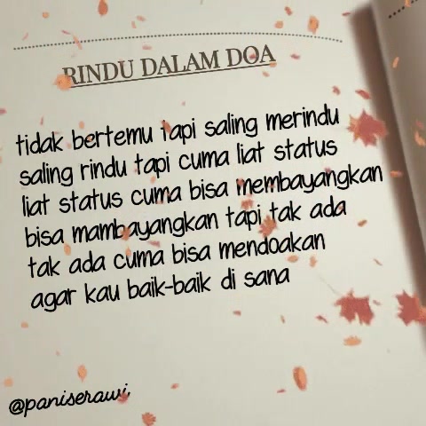 Doa rindu. Ketika perasaan rindu sudah sangat membuncah dan tak terbendung janganlah kita menuruti bisikan bisikan syaitan untuk menuruti hawa nafsu. Anda dapat mengamalan amalan agar kekasih hati selalu rindu dengan kita yang anda disini maka insya allah kekasih atau pasangan suamiistri anda tidak akan selingkuh karena dia akan selalu rindu. Kau telah menjadi nada sebelum aku mengenal bunyi yang menuntunku pada suara hujan jauh sebelum ia jatuh.