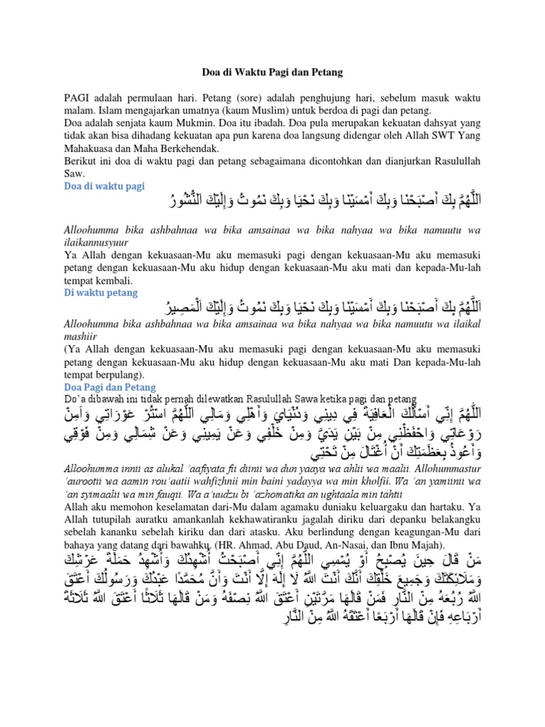 Doa rasulullah waktu pagi. Ketika kita tahu doa pagi hari ajaran islam maka kita sebagai umat islam selayaknya meneladani beliau yang selalu berdoa di awal pagi yaitu setelah shalat shubuh. Rasulullah saw apabila waktu pagi baginda membaca allhumma bika ashbahnaa wa bika amsaynaa wa bika nahyaa wa bika namuut wa ilaikal mashiir ya allah dengan mu aku memasuki pagi dengan mu aku memasuki petang dengan mu aku hidup dengan mu aku mati dan kepada mu aku kembali. Abu hurairah ra meriwayatkan sejumlah doa yang diajarkan oleh rasulullah saw yang dibaca ketika pagi hari sebagaimana dikutip oleh imam an nawawi al adzkardamaskus.